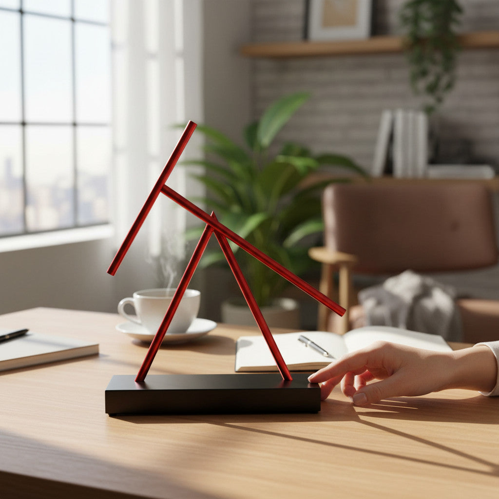 Dinamismo in nero e rosso - La base in nero profondo combinata con aste lavorate con precisione in rosso brillante crea accenti potenti e sottolinea il linguaggio di design chiaro e minimalista di questa scultura cinetica. Un pezzo di grande effetto per interni moderni, ambienti di lavoro creativi e spazi abitativi puristi, in cui design e movimento si fondono per creare un richiamo visivo espressivo.